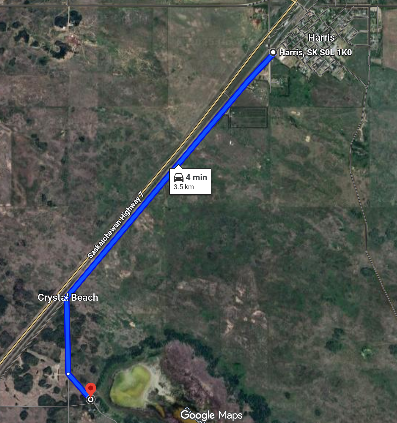 Take Hwy 7 to Harris.  Cross the railroad tracks, then take the old highway road on the south side of the tracks 2.5 km west.  Turn south at the sign and keep left to the end of the road.