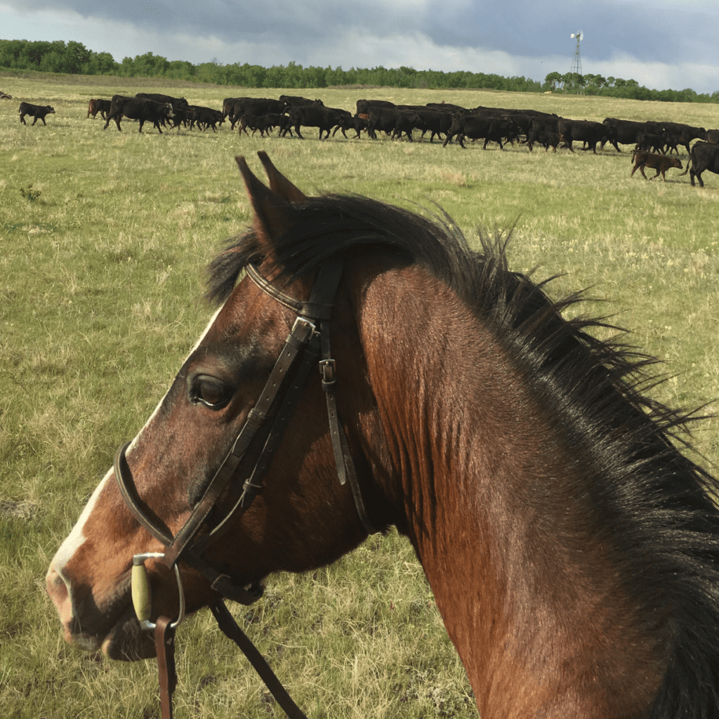 One day we were moving cow/calf pairs out of the corrals to go onto cleaner pastures. Spring often creates a substance in the corrals that I will politely refer to as “mud/muck” After slogging through this knee deep slop for much too long, I decided to hop on Bram bareback, he could do a bit of slogging. One nasty mama cow decided to be overly protective of her calf, and had us cornered against a slab fence and came at us. Now I ‘m not sure if everyone has really slow, clear thoughts in moments like this, but I remember these ones (slightly modified for polite company) “Oh sh%t! I’m going to get both of us really hurt and its all my fault” “Cows are best on a plate” “Next time a helmet and a wetsuit might be a good idea” “he’s not panicking, good pony” “ holy crap you are a rockstar, thank you!”. All of these thoughts in a split second. Brams heart rate never increased, knowing we had no escape route, he calming rocked back on his hocks performing a perfect levade and “punched” the cow on her nose with his front hoof. This was not a trained skill! I decided at that moment that he would stay and that I was the little girl who deserved this great pony! He has since saved my life on numerous occasions, the ones I know about are cougar, wild boar, moose, coyotes, rogue deer flying through the bushes at us.